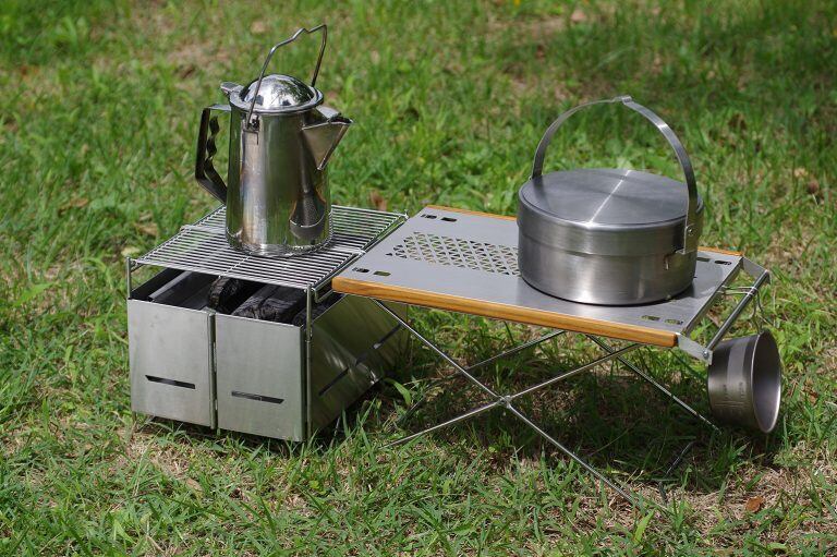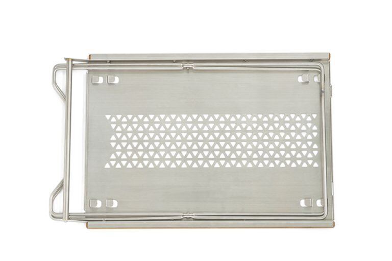 ステンレス天板なので熱いものやバーナーを置いても使用できます。サイドバーには小物やLEDなどが吊り下げられ、折りたためば軽量コンパクトで持ち運びしやすい設計。天板には透かしが施してあるためオシャレで家の中でもお使いいただけるデザインです。
