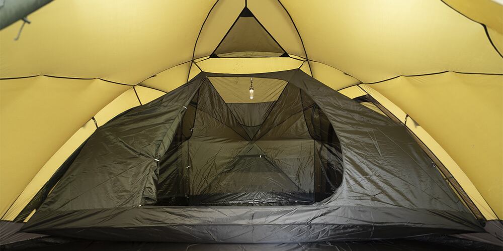 Dome X6 Proテントは6人収容可能です。また、テントストーブ付きのソロキャンパーのために広い内部生活空間を提供し、インナーテント(別売)とテントには3つのドアがあり、インナーテントから直接出入りすることができます。