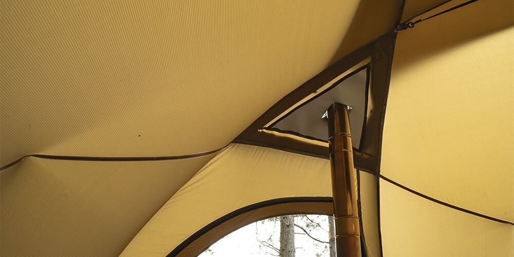 取り外し可能なグランドシート(別売)は、薪ストーブのために設計されています。ストーブジャックの真下に耐熱織物があるので、燃える炭素の火がフロアマットに落ちてもグランドシートを燃やすことはありません。グランドシートを外すと、Dome X6 Proは穴釣りできるホットテントになります。
