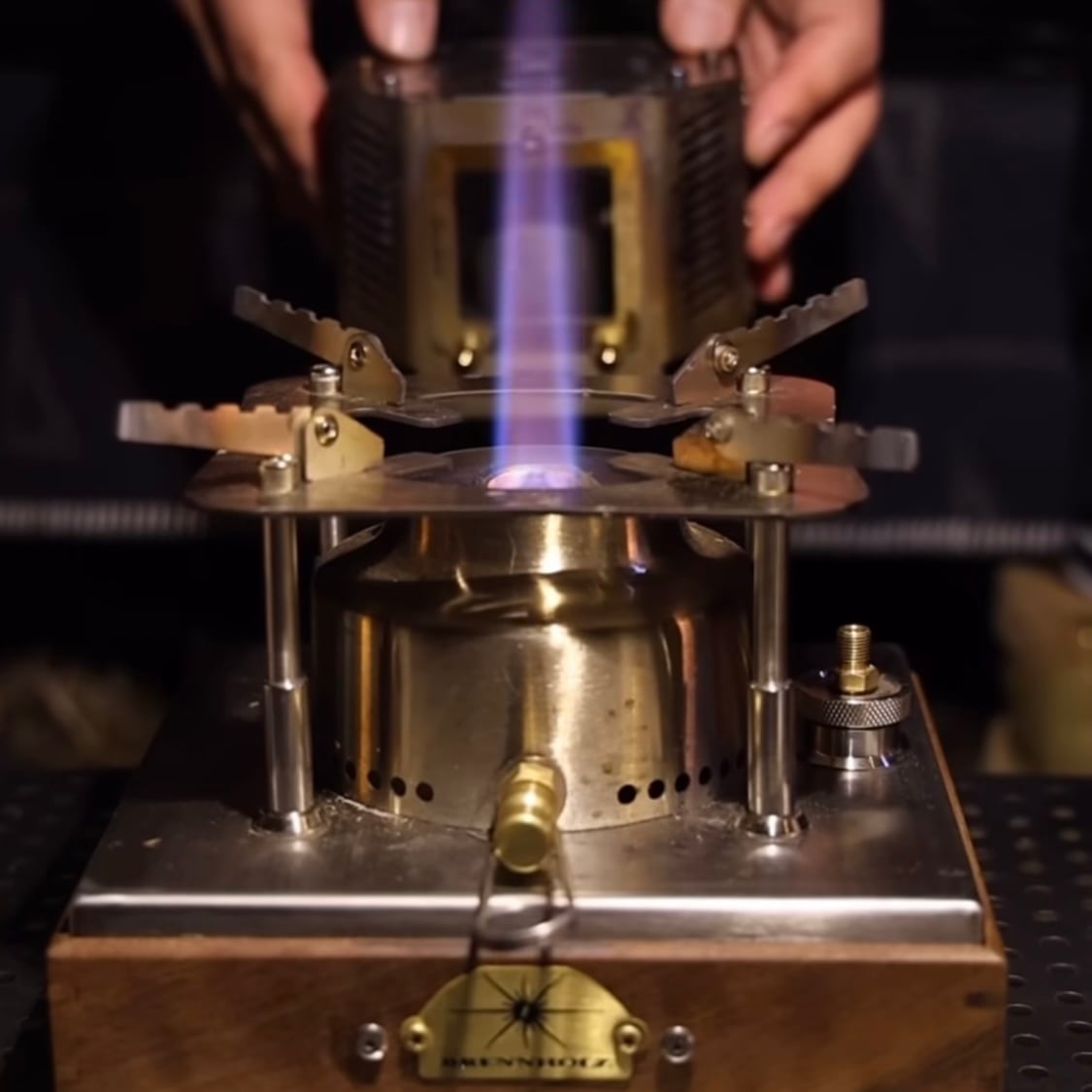 予熱が完了したらバルブを少し開け、バーナー噴出されるアルコールガスに点火します。