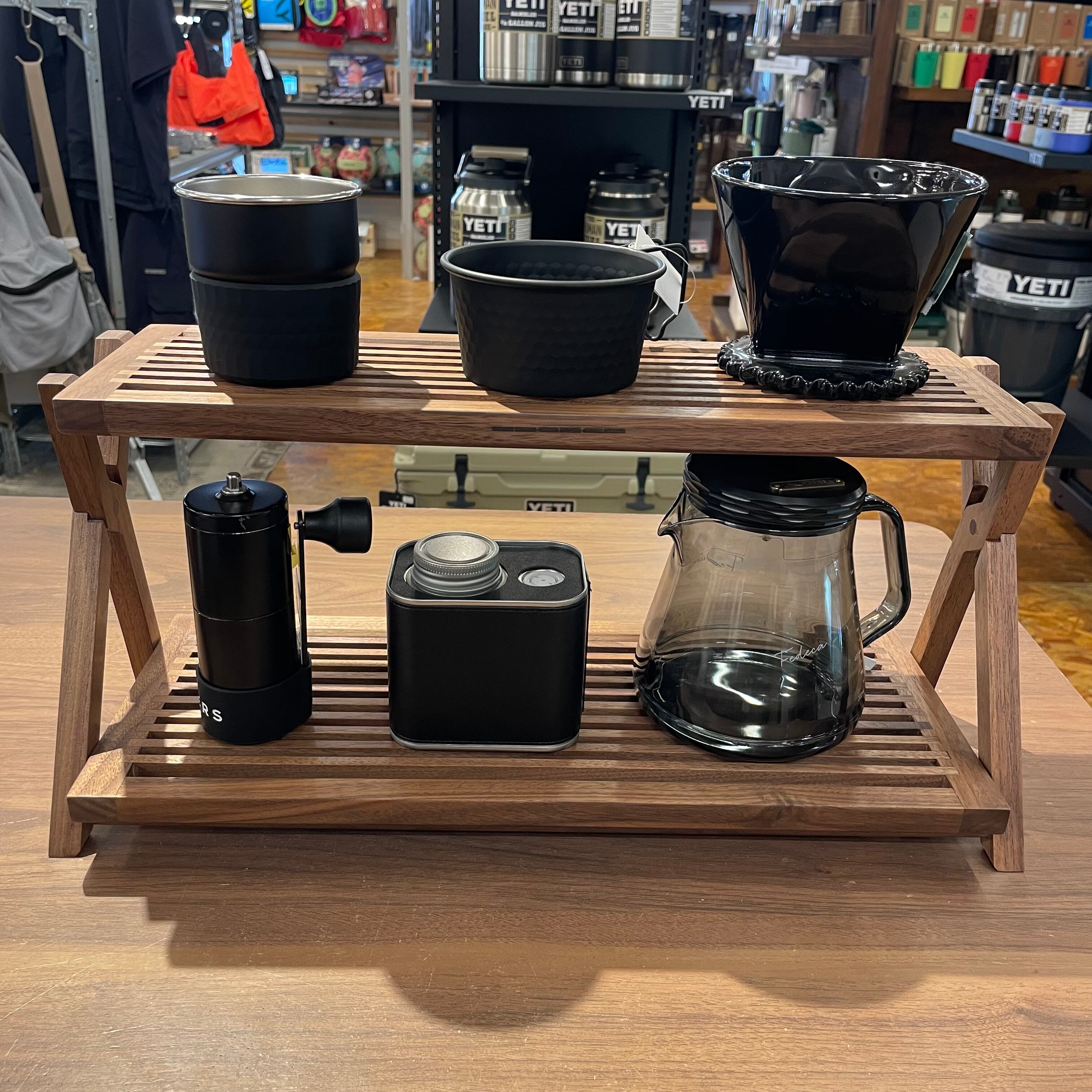お気に入りのギアを美しく並べて、自分だけのアウトドア空間を演出できる折り畳みのラックです。