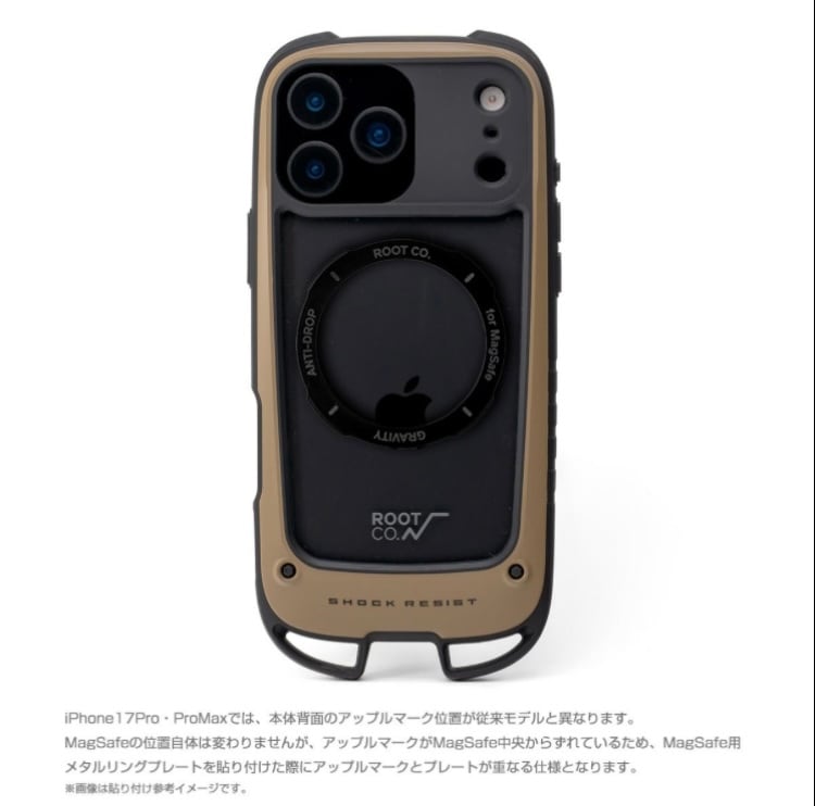iPhone17Pro・ProMaxでは、本体背面のアップルマーク位置が従来モデルと異なります。MagSafeの位置自体は変わりませんが、アップルマークがMagSafe中央からずれているため、MagSafe用メタルリングプレートを貼り付けた際にアップルマークとプレートが重なる仕様となります。あらかじめご理解のうえ、ご購入・ご使用くださいますようお願い申し上げます。