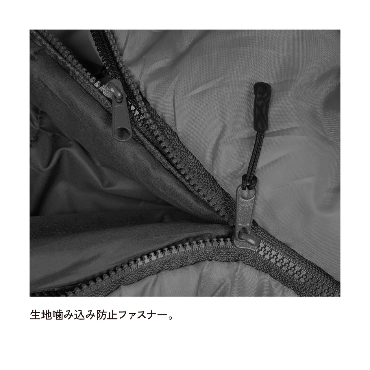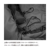 ●上部からの冷気を防ぐドローコード付きのフード、首からの冷気侵入を防ぐショルダーウォーマー、ファスナーからの冷気侵入を防ぐドラフトチューブ、寒い夜を快適にすごすため細かいところまでこだわり作り込まれています。