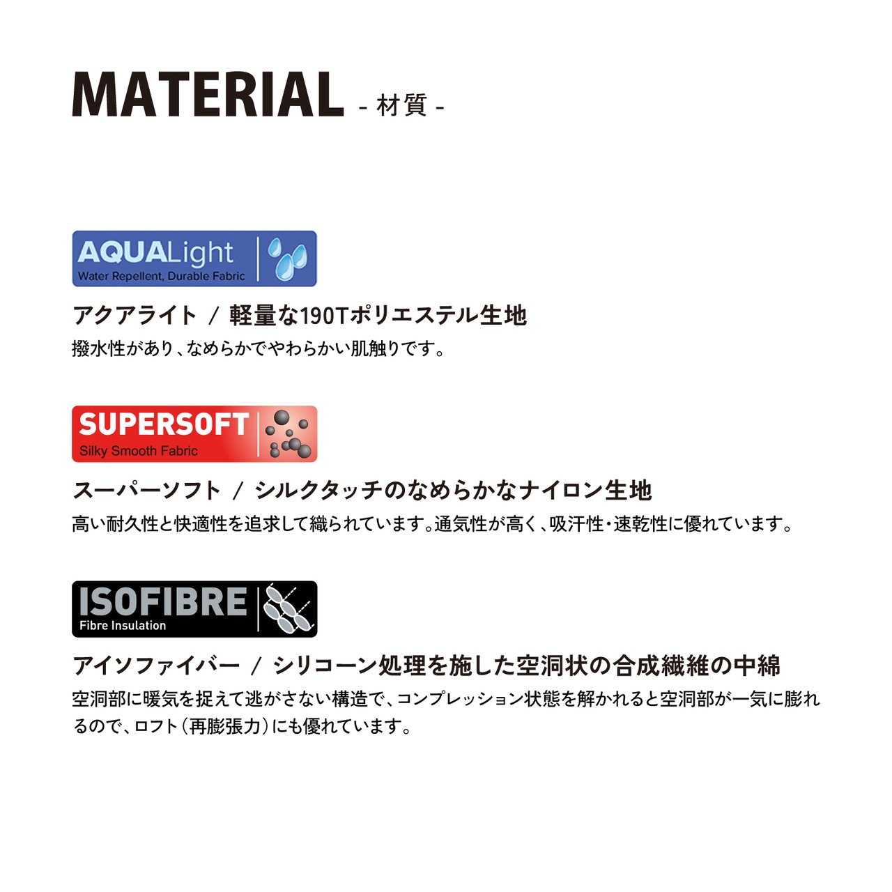 ●外側の生地には190Tの軽量なポリエステル生地「AQUA Light」を使用。撥水性がありなめらかで肌触りが良いです。