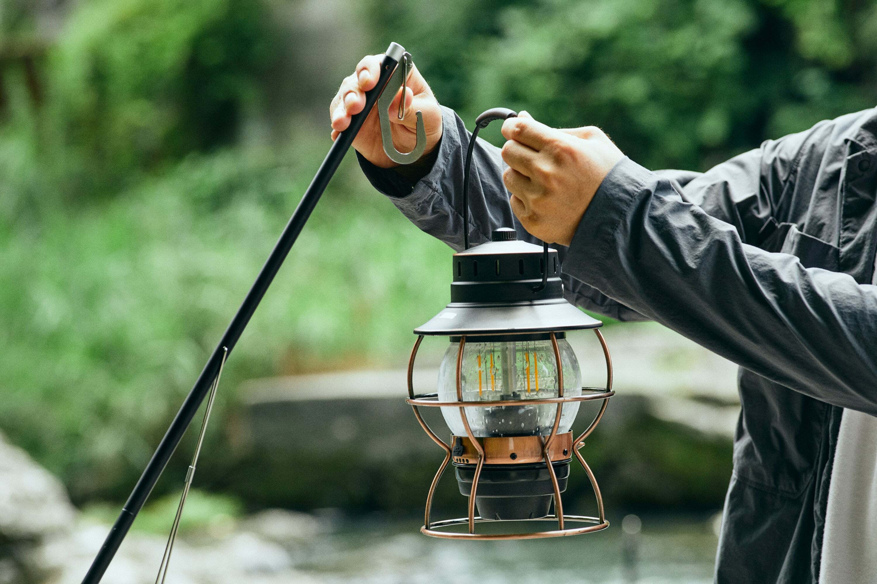 フック部分はカラビナのような形状なので、一度フックに引っ掛ければ外れて落ちることはありません。取り外しも簡単です。(※燃料を使うランタンは使用不可)