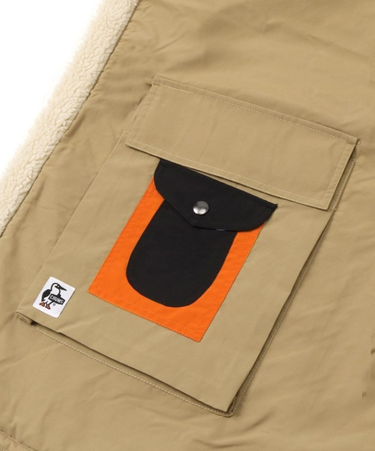 アクセントで配した2層の小物ポケットはカイロを入れたり等、実用性高く活用できます。
