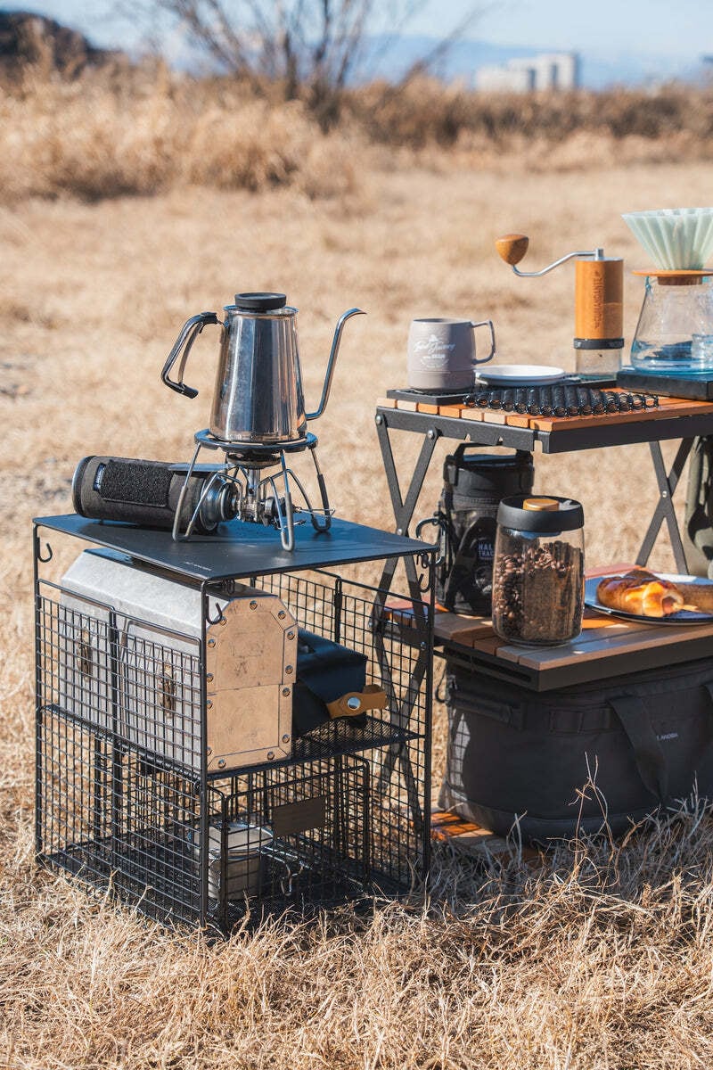 スチール素材なので、焚き火周りでの使用や、火器の使用も可能。