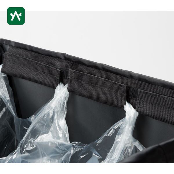 ベルクロでポリ袋を3つまで取り付けることができ、分別にも対応。夜間や外出時などには、折り返しになっている巾着を締めて、口を閉じておくことも可能です。