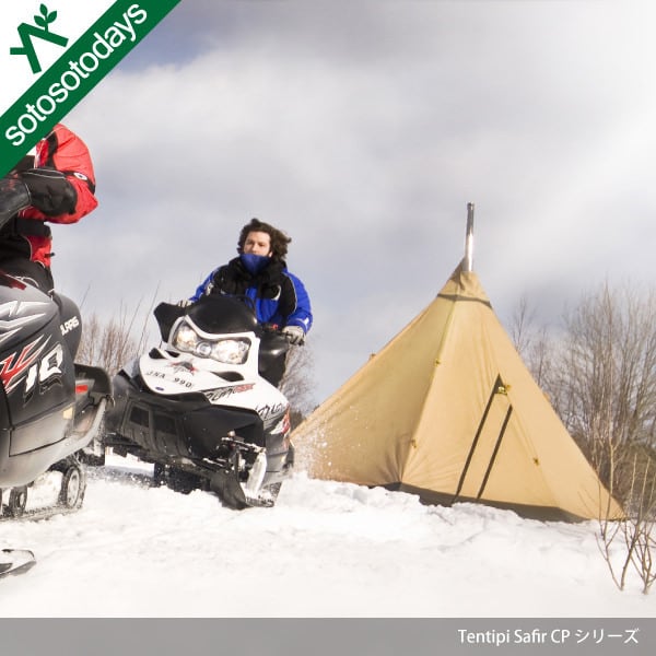 このサファイアCPはテンティピテントの最上位モデル。ボディの素材はコットンとポリエステルの混紡素材Cotpolmex P.を用いているためキャンバス地のような風合いです。この素材は一般的なポリエステル素材に比べ「呼吸」するため結露は最小、インナーテントは必要ないほどです。