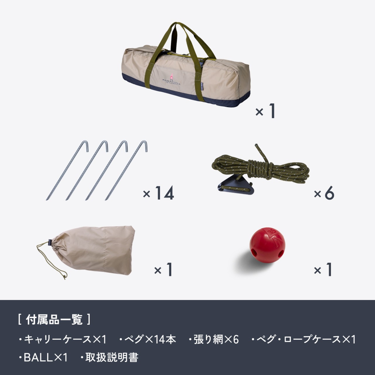 ・付属品 ・本体×1 ペグ×14 ロープ3.5m×6 BALL×1 収納ケース×1