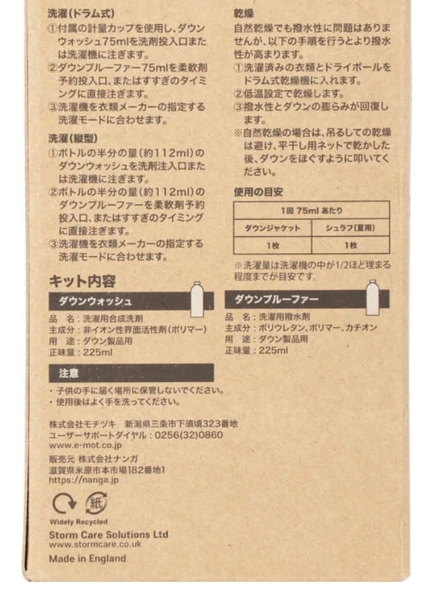 ダウン製品全般の洗濯、クリーニングに使える洗剤と撥水剤が、NANGA特注パッケージに。撥水剤と一度に入れて洗濯できるの大きな特徴。汚れを落としながら、ウェア本来の機能を回復させ、長持ちさせます。
