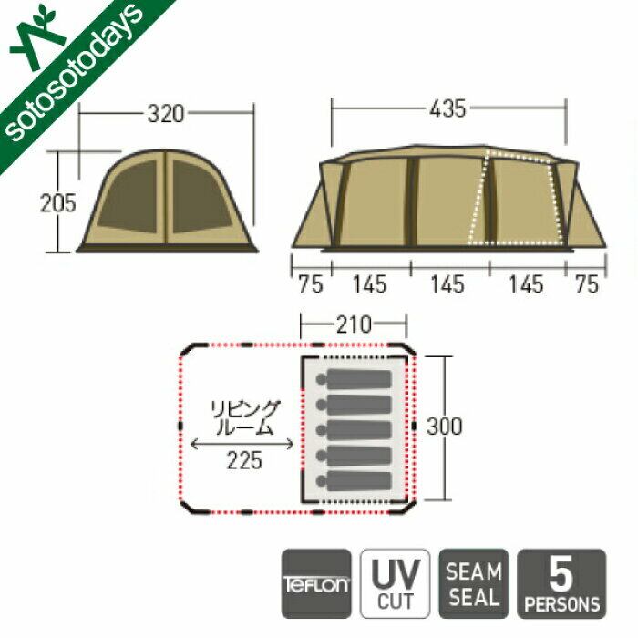 ■素材/フライ:ポリエステル210d(耐水圧1,800mm)、インナーテント:ポリエステル68d、グランドシート:ポリエステル210d(耐水圧1,800mm)、ルーフフライ:ポリエステル75d(耐水圧1,800mm)、メインポール:アルミφ19mm×2、アルミφ17.5mm×2、リッジポール:アルミφ14.5mm×3