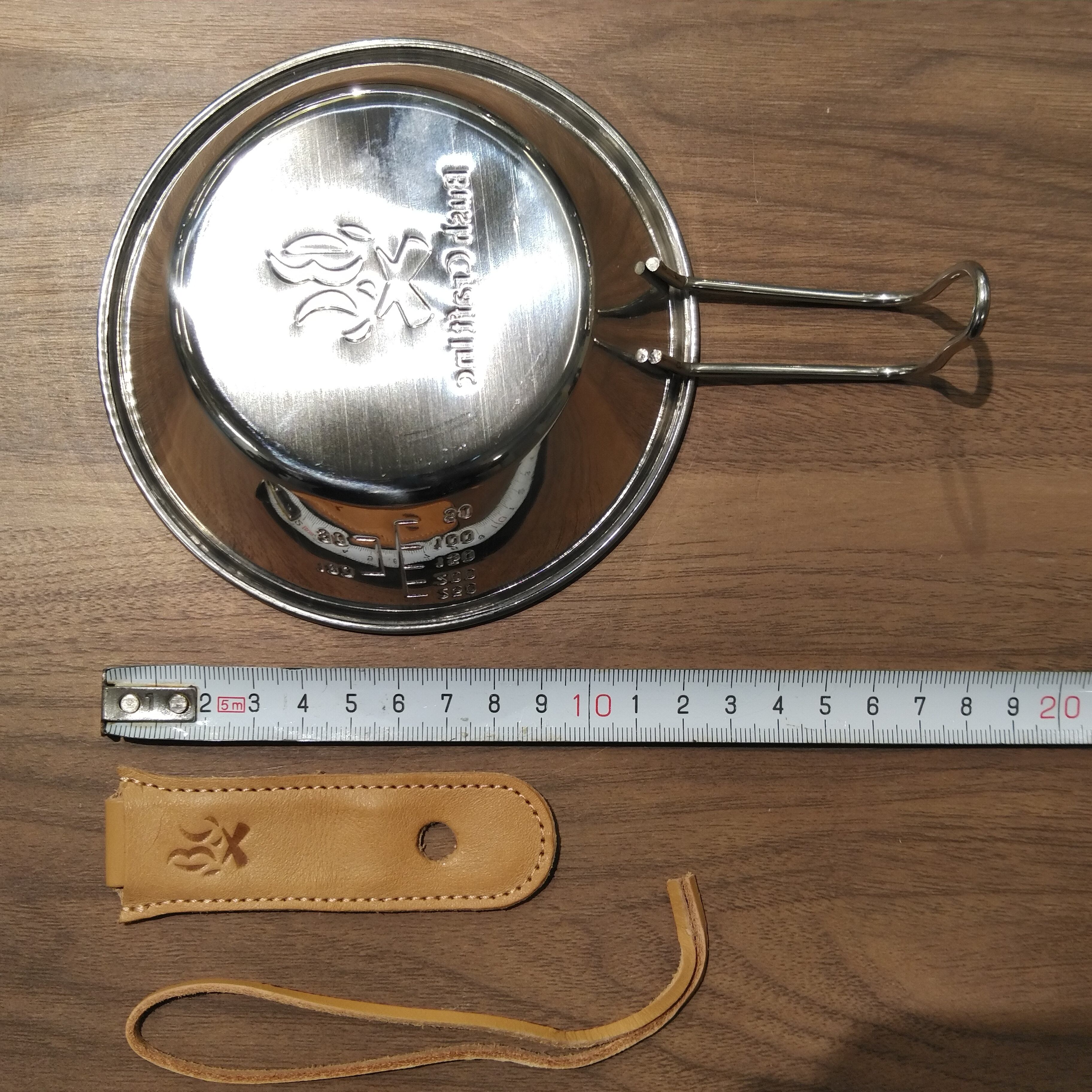 レザーハンドルカバー付きのステンレス製シェラカップです。