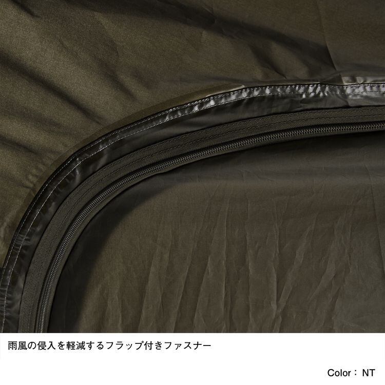付属インナーは吊り下げ式で、天候に左右されることなく容易な設営と取り外しができます。出入口面は、キッチンやリビングスペースとして活用できる大型シェルター