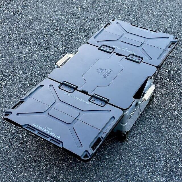 最大の特徴はZ型に展開する天板、1台の面積から3台分のサイズまで拡張します。