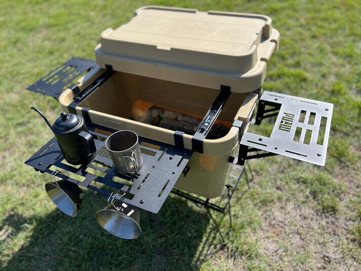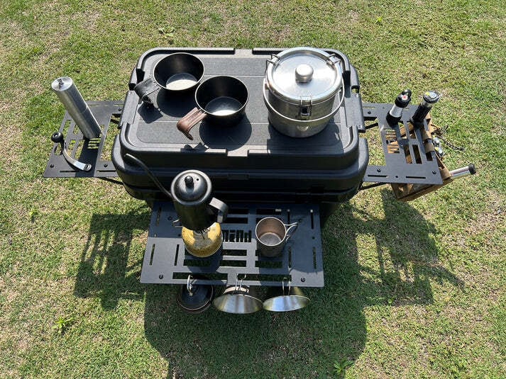 20mmレールを取り付けたり、ベルトを使って天板の下にガスをセットしたりとカスタマイズ部品を追加することで、様々な使い方をすることが可能になります。