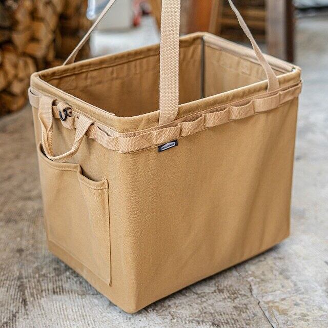 帆布素材ならではの燃えにくさはそのままに、さらに薪などのやや重めの荷物を運ぶことを想定し、フレームをHD(ヘビーデューティー)仕様に変更(経5mmのスチールワイヤー)。