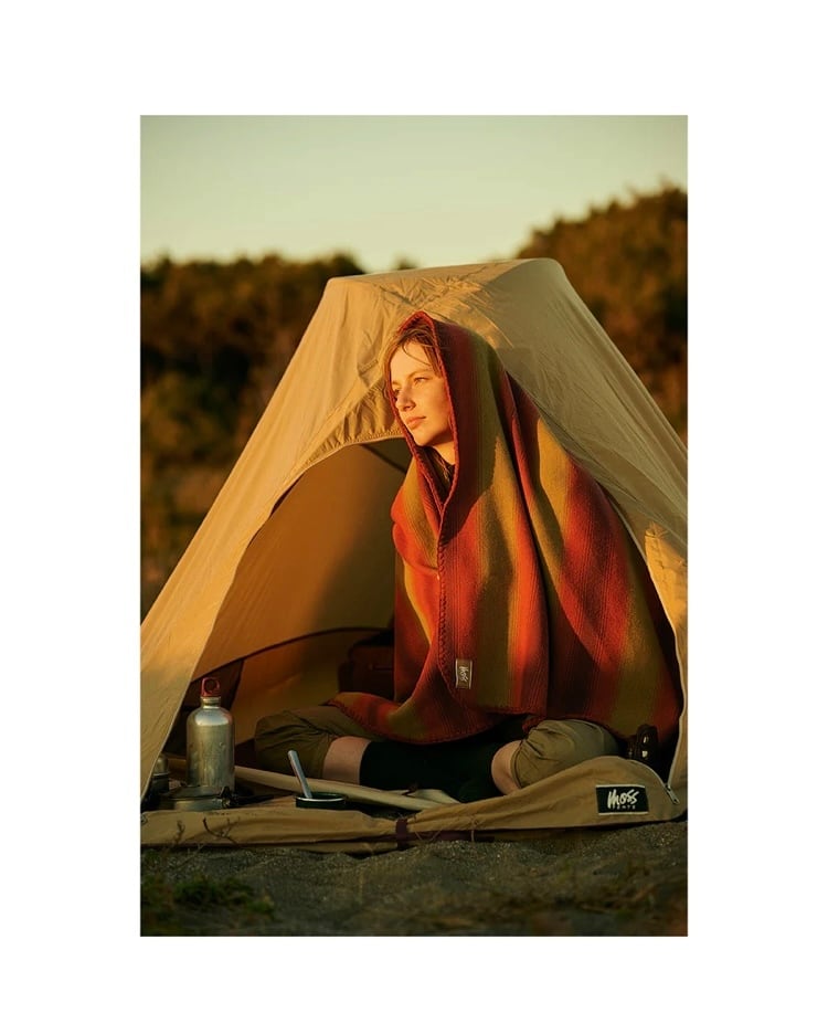 ブランケットのカラーは、ビル・モス生誕100周年記念カラーのオレンジ色をベースに染められた糸を使用しています。自然になじみやすい色合いでありジェンダーレスなデザインは、キャンプなどのアウトドアライフで使用するのはもちろんのこと、日常生活でも使用用途をアレンジしやすい大判サイズ。