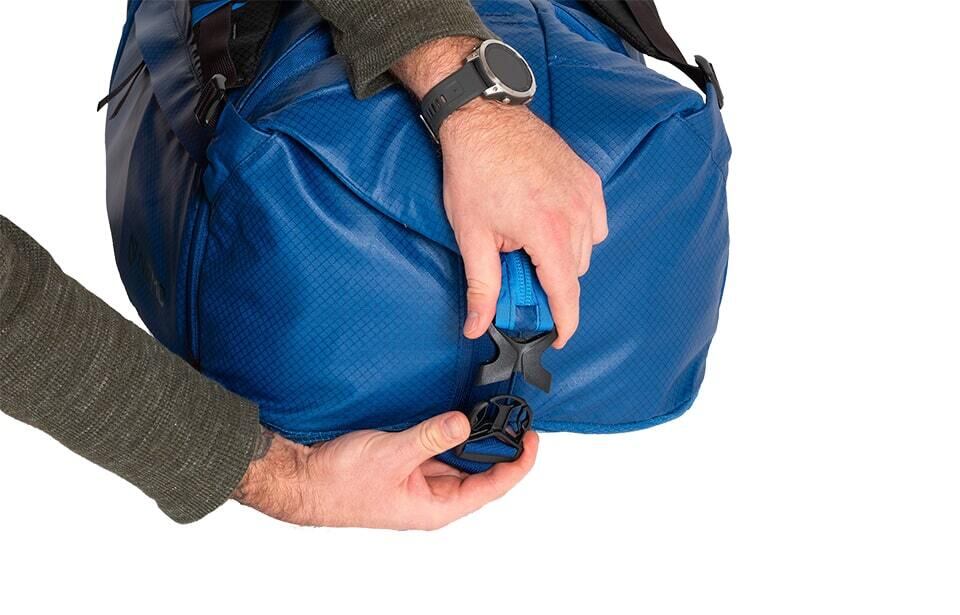 独自のトラス構造に剛性を持たせることで、開口部を大きく開いたままの状態をキープして容易なパッキングを可能にしました。また、長旅や飛行機での移動時にはコーナーを折りたたんでバックルで固定し、ダッフルバッグまたはバックパックとして持ち運ぶことができます。