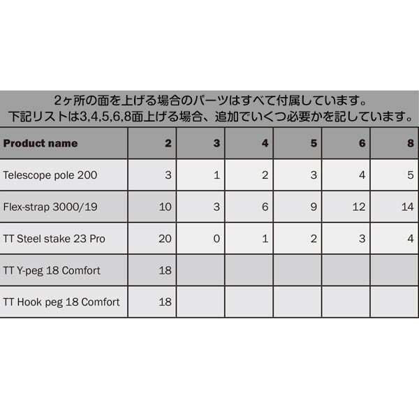 立ち上げるための伸縮ポールは3本付属。ストラップも10本付いてますので、大人数で使う場合以外は買い足す必要がありません。4ヶ所以上上げる場合に必要なオプション数は最後の写真の表をご覧ください。