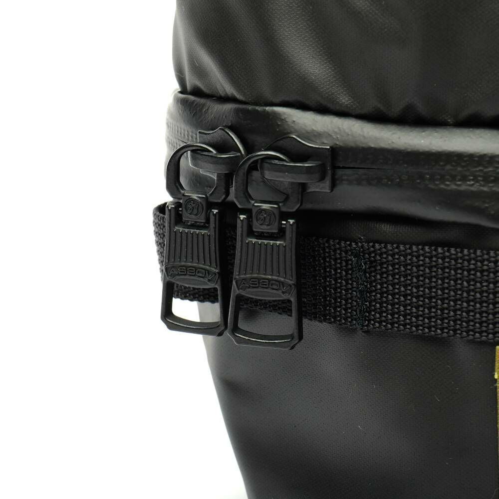 本体素材は、210Dナイロンにポリカーボネートのコーティング を施した生地を使用しています。PUコーティングに比べ 剥離の耐久性が強く生地自体の防水性の持続性にも優れた素材です。